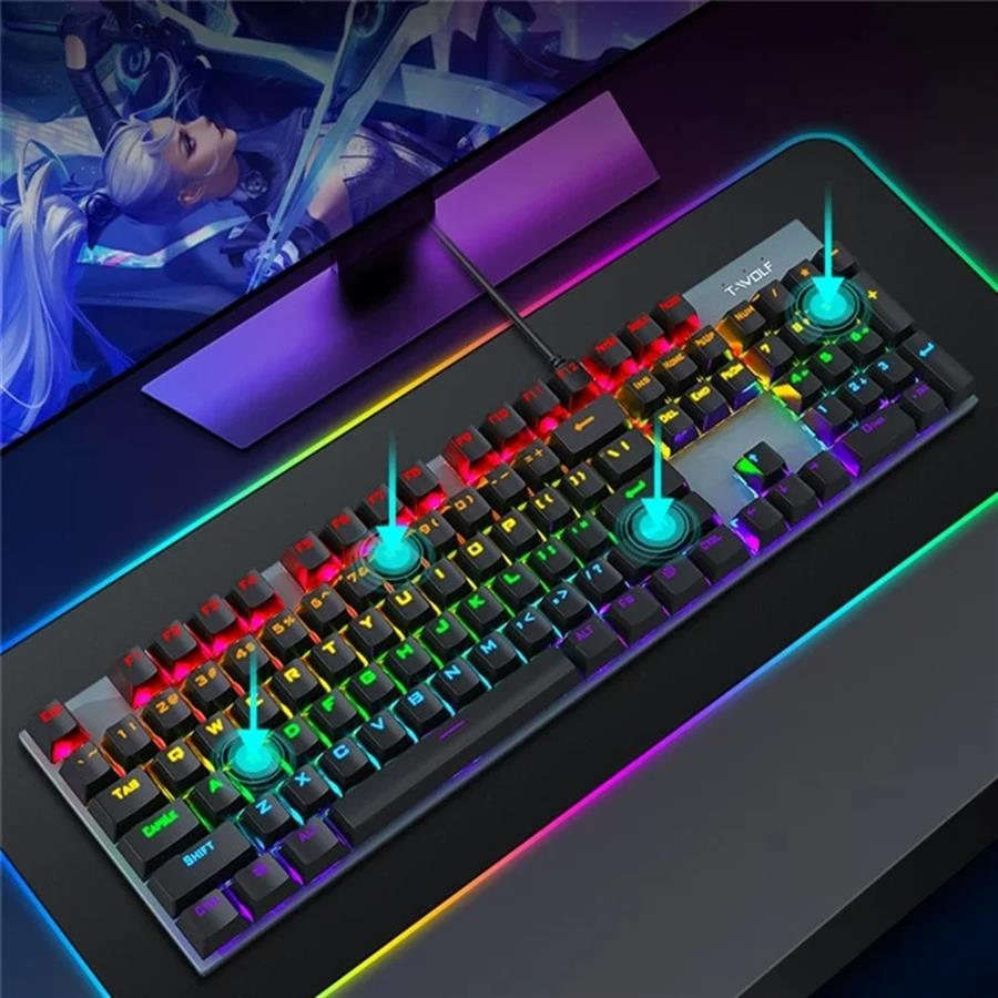 Teclado mecánico para juegos T-WOLF T17 con cable USB, retroiluminado a color, de 104 teclas